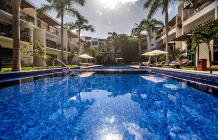 Spectacular condo within Mareazul, a development in front of one of the best beaches, located within the exclusive Corasol complex, boasting the best and most generous common areas in the Riviera Maya, lush gardens with water fountains and the largest and most spectacular private pool of its kind.
